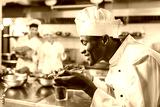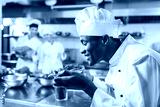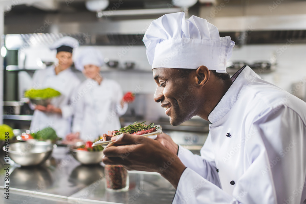 smiling african american chef sniffing raw meat with herbs at restaurant kitchen