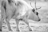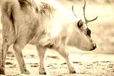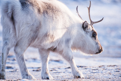 Landscape with wild reindeer. Winter Svalbard. with massive antlers in snow, Norway. Wildlife scene from nature Spitsbergen