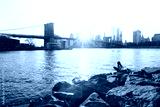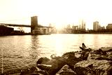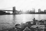 Blurred of a girl sitting on rocks with the view of Brooklyn Bridge and Manhattan skyline at sunset in vintage colour