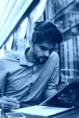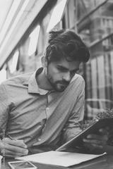 Business man working on digital tablet in street cafe. Businessman writing document.