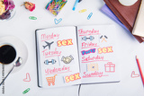 Top view Planning Organizer with colourful pictures of actions on the working place with stationery and coffee. Creative image of day planning in daily life. Week Planner Concept. Selective focus.