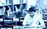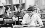 Portrait of successful bearded student man wears white shirt studying with books in the library