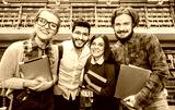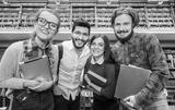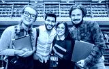 Group of smiling students, two young men and women standing before library bookshelves, holding books and laptop, concept of teamwork