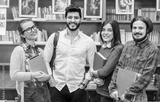 Group of smiling students, two young men and women standing before library bookshelves, holding books and laptop, concept of teamwork