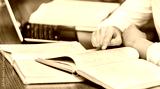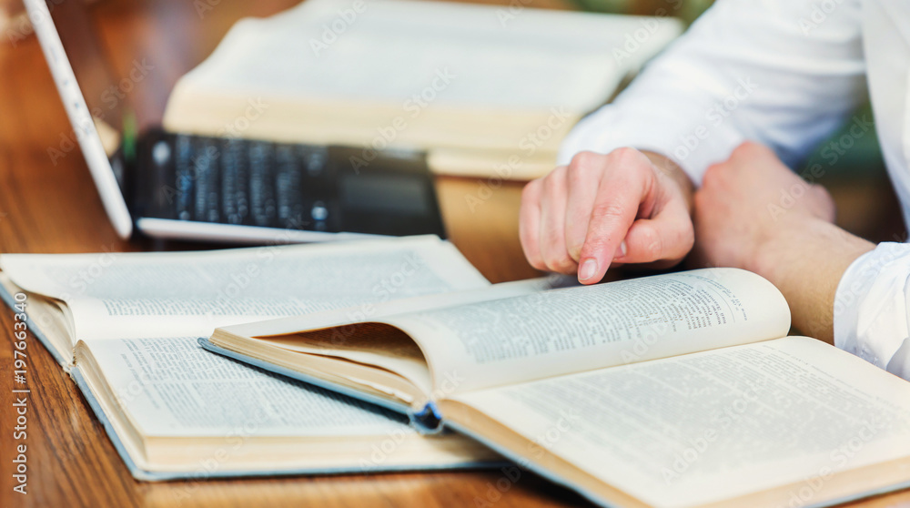 Table workspace of student man with books and laptop