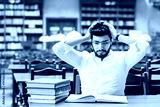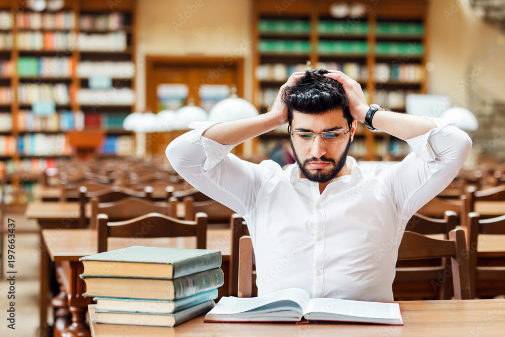 Portrait of young thinking bearded man student with stack of books on the table before bookshelves in the library