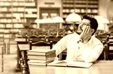 Portrait of young thinking bearded man student with stack of books on the table before bookshelves in the library