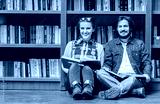 Couple of young students sitting on the floor with books before bookshelves in the library