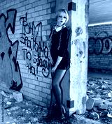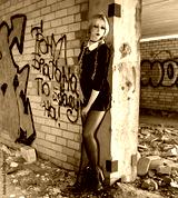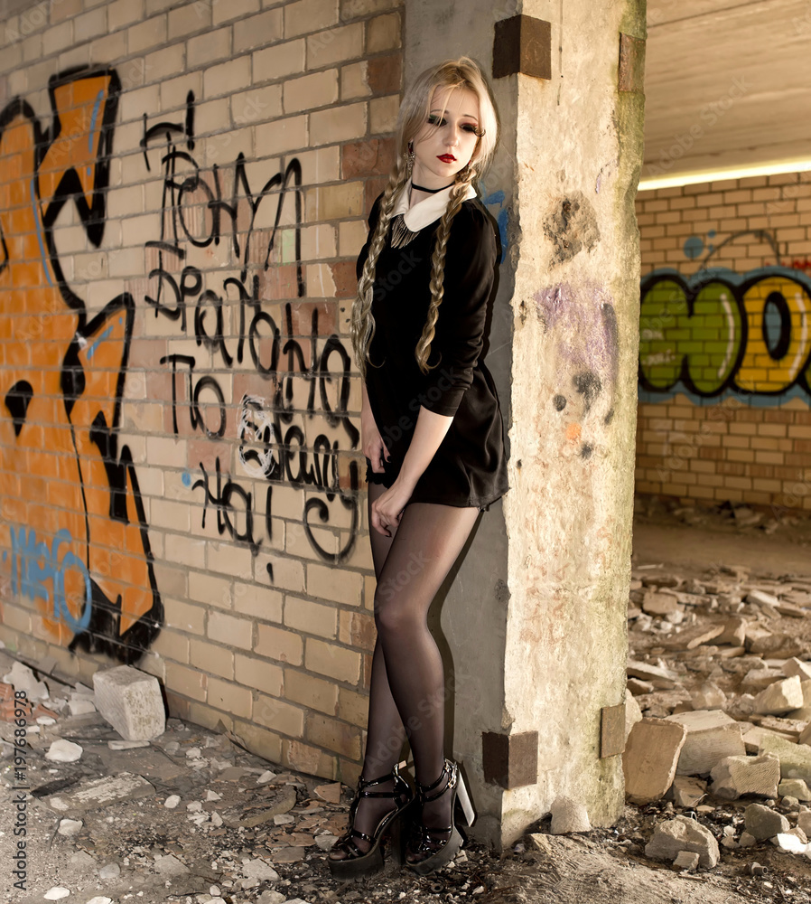 Blonde girl wearing black dress in an abandoned house