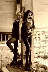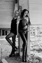 Two sexy girls in black gothic dresses are giving sexy poses in the old abandoned building