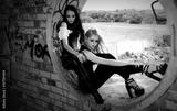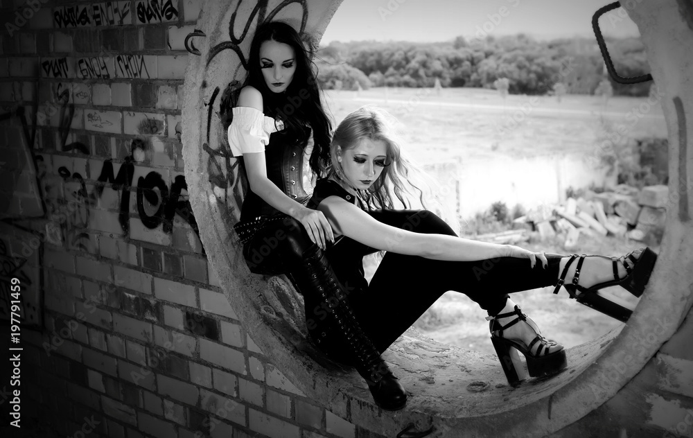 Two sexy girl at gothic dress are sitting in the round window and posing