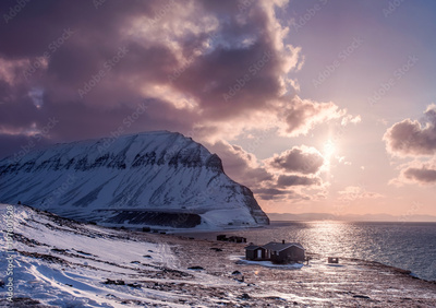landscape of the Arctic Ocean and reflection with blue sky and mountains with snow on a sunny day, Norway, Spitsbergen, Longyearbyen, Svalbard, summer,