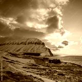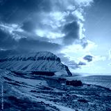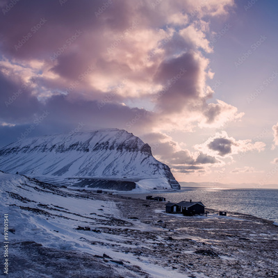 landscape of the Arctic Ocean and reflection with blue sky and mountains with snow on a sunny day, Norway, Spitsbergen, Longyearbyen, Svalbard, summer,