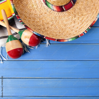 Mexico cinco de mayo background border square format with sombrero straw hat traditional rug or blanket and maracas on an old blue wood background fiesta carnival photo