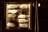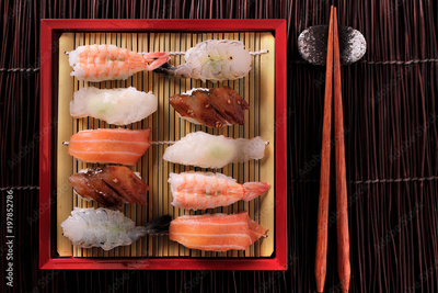 Sushi assortment various different selection japanese food on a red lacquer bamboo tray with chopsticks photo