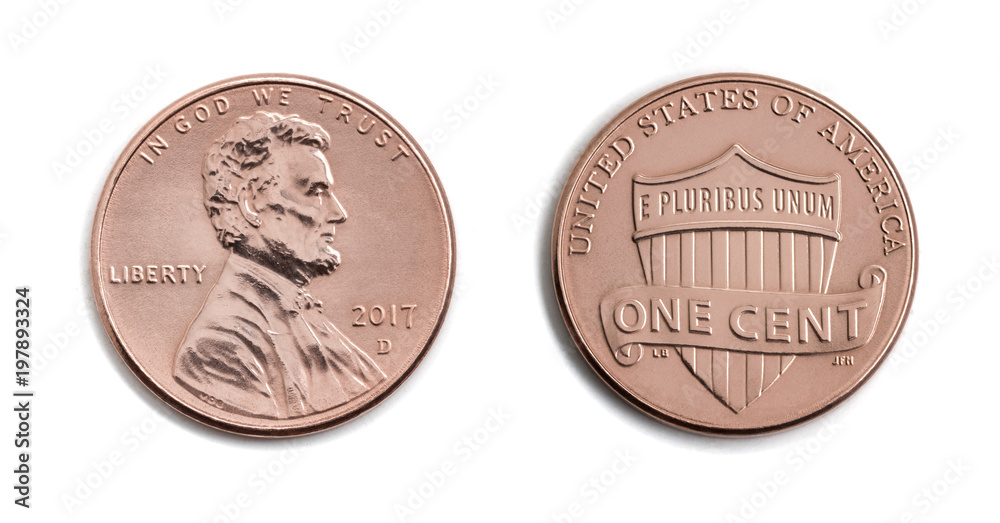 american one cent, USA 1 c, bronze coin isolate on white background. Abraham Lincoln on copper coin realistic photo image - both sides