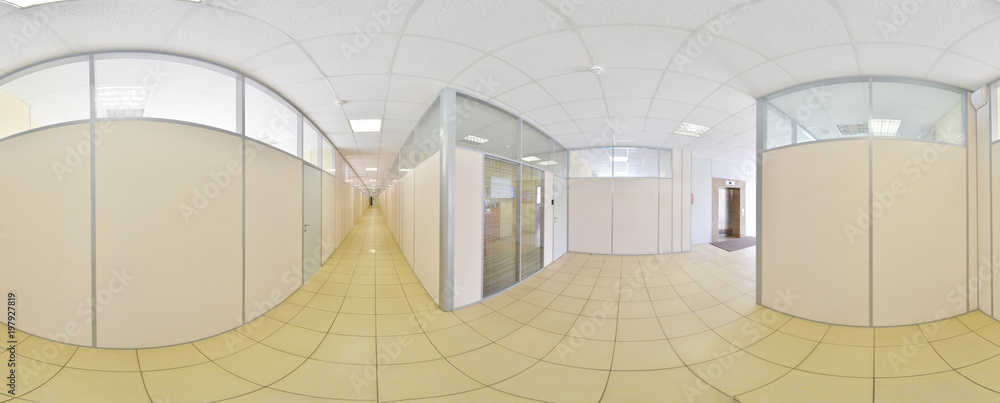Spherical 360 degrees panorama projection, panorama in interior empty long corridor with doors and entrances to different rooms.