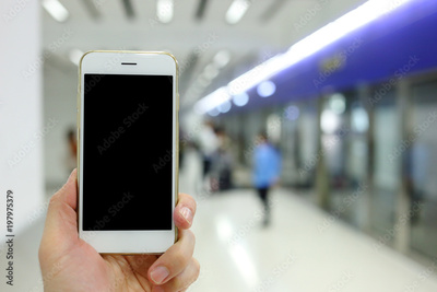 Hand holding white mockup smartphone with subway station background
