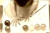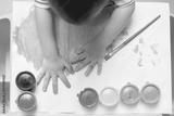 Bird eye view / Top view of little Asian 18 months / 1 year old toddler baby boy child finger painting with hands and watercolors, kid painting at home, Creative play for kids and toddlers concept