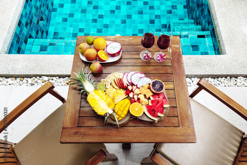 Colorful tropical fruit plate by the pool