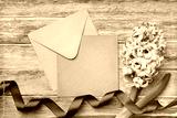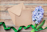 Envelope, hyacinth and ribbon on wooden vintage table top view. Happy Mothers Day holiday greeting card with flowers.