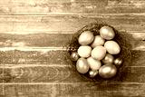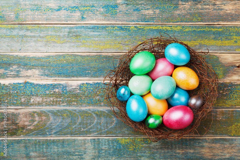 Colorful Easter eggs in nest on wooden rustic background top view. Holiday greeting card.