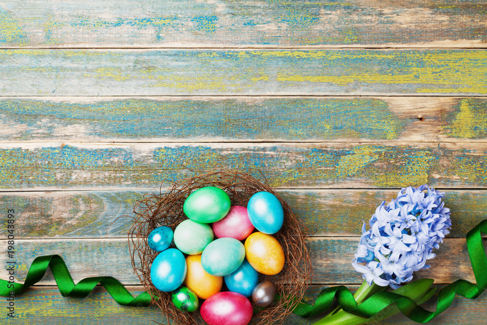 Painted colorful Easter eggs in nest with hyacinth flowers and ribbon top view. Festive background for spring holiday in rustic style.