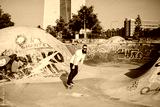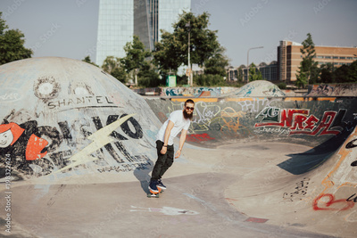 Young man with his beard skateboarding through the city