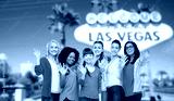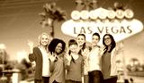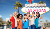 diversity, ethnicity, tourism and travel concept - international group of happy smiling different women or friends waving hands over welcome to fabulous las vegas sign background