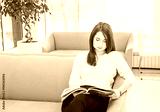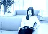Portrait of young girl sitting on bright yellow sofa in modern waiting hall and reading a magazine. Hospitality, medicine, business concept. Selective focus. Space for text.