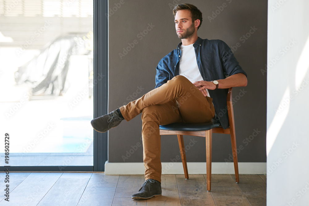 Fashionable young professional looking off into the distance while seated in a beautiful wooden chair in his modern home with a lovely grey textured wall behind him and a large glass pane window.