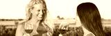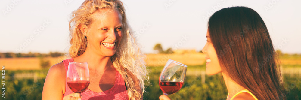 Wine tasting people drinking at vineyard outside at sunset. Fun summer activity banner panorama. Two women talking with a glass of red wine.