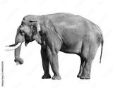 Elephant close up. Big grey walking elephant isolated on white background. Standing elephant full length close up. Female Asian elephant with small bundle of hay in the trunk.