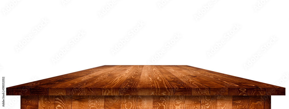 Empty dining table vintage style with clipping path in perspective view for product placement or montage with focus to table. Wooden board surface.