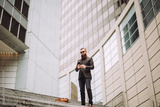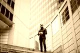 young businessman with the beard looking in the phone. In the back he sees the officers at the bank