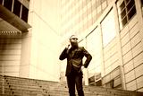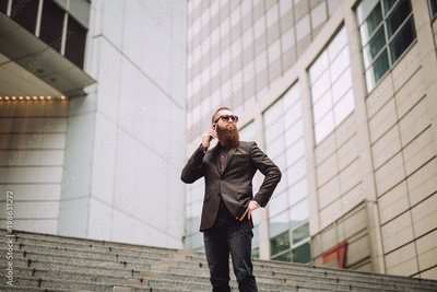 Young businessman with the beard talking on the phone.In the back he sees the officers at the bank