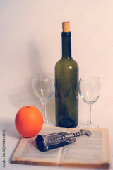 Bottle, two glasses, a corkscrew and an orange on an old book