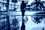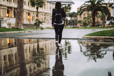 Young girl is holding the umbrella.The woman sitting with her back down is reflecting the water