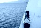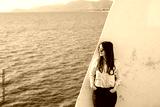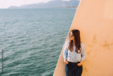 Beautiful girl with sunglasses rests against the yellow wall. In the background, the beautiful sunset and the beginning of the sunset