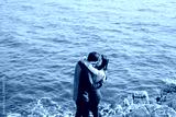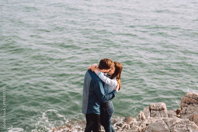 romantic couple kissing near blue sea. In the back is a beautiful spring landscape