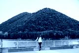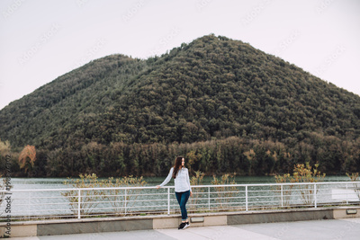 Young girl stands beside a beautiful lake. In the back there is a green hill