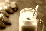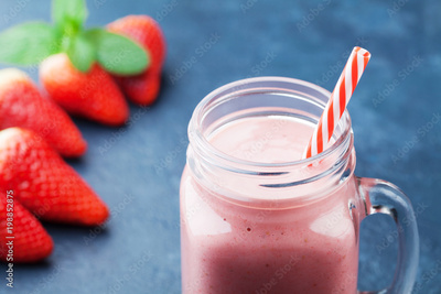 Delicious strawberry smoothie or milkshake in mason jar on dark blue table. Healthy food for breakfast and snack.
