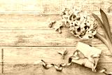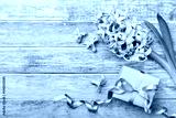Happy Mothers Day holiday greeting card with hyacinth flowers and gift or present box on wooden rustic table. Top view.