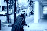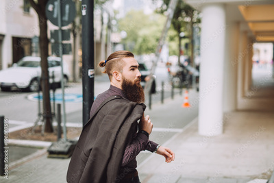Young man with the beard goes on the street. on the back you stylish classic jacket