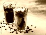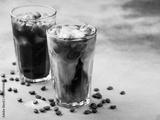 Ice coffee in a tall glass with cream poured over and coffee beans. Cold summer drink on a blue rusty background with copy space