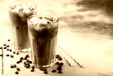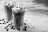 Ice coffee in a tall glass with cream poured over and coffee beans. Cold summer drink on a blue rusty background with copy space