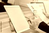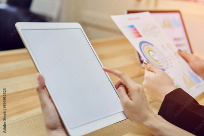 Woman using blank screen tablet. Blank screen for the graphics. Concepts for Digital Technology in Everyday Life.
