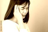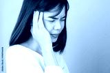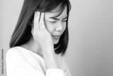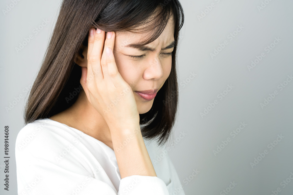 Woman in a white dress is touching head to show her headache. Causes may be caused by stress or migraine. Or because too much work. The concept of stress from hard work is bad for health.