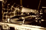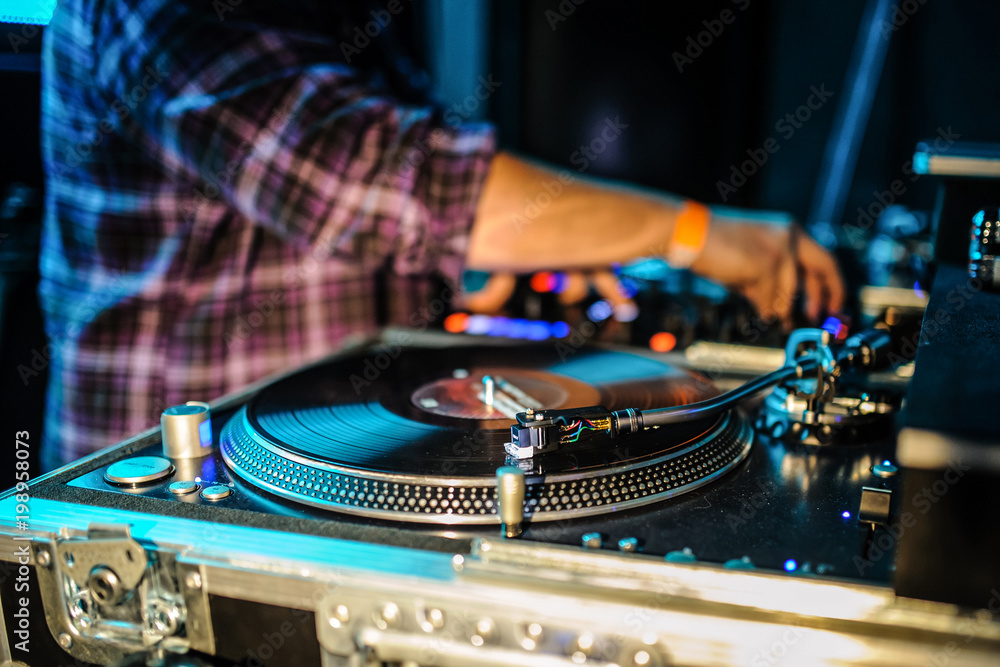 Close up of dj control panel playing party music on modern player in disco club