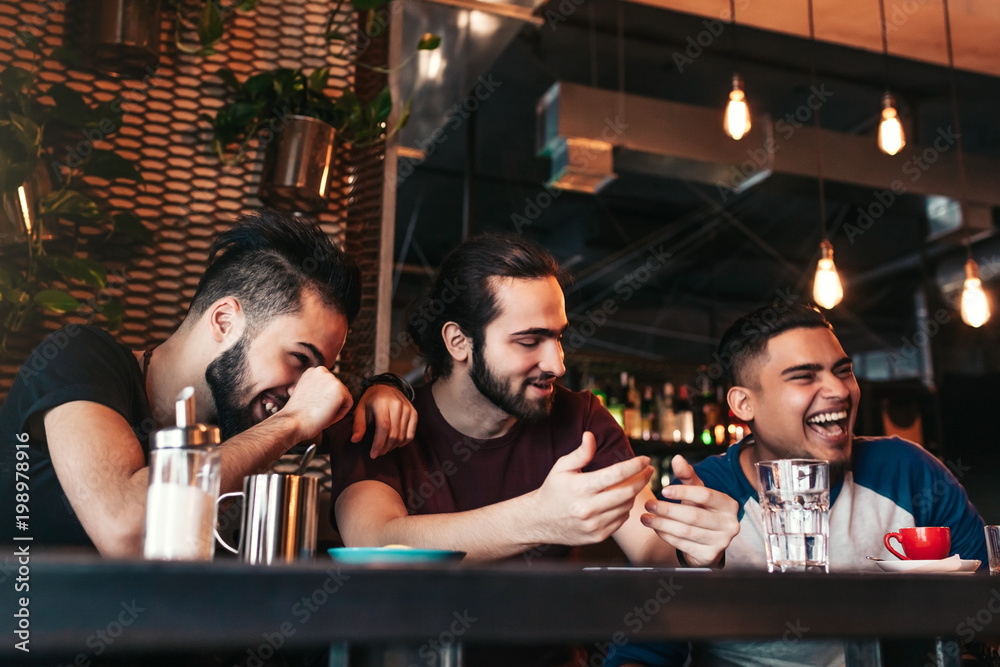 Happy arabian young men hanging in loft cafe. Group of mixed race people having fun in lounge bar